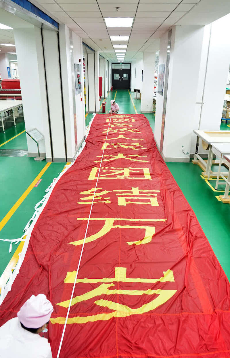 508所专家表示,每一幅旗面材料都是精挑细选的,表观质量有污渍、破损、断丝现象的一律不用,色差明显的面料果断更换。因为是巨幅党旗、标语,加工过程中需要面料的拼接、缝合。