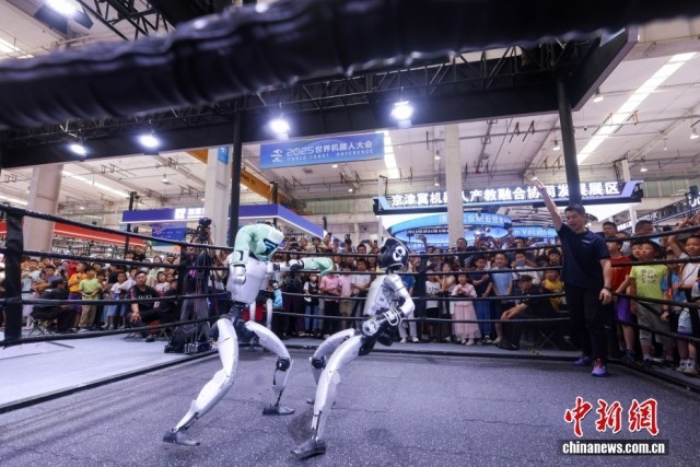 8月11日,2025世界机器人大会继续在北京亦庄举行,展出的各类机器人刮起运动旋风。图为人形机器人上演综合格斗表演赛。