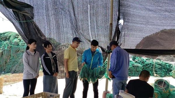 在牡蛎养殖作业现场,团队成员、指导老师和养殖人员正围绕养殖网笼开展技术交流与实操研讨。谢雨欣/摄