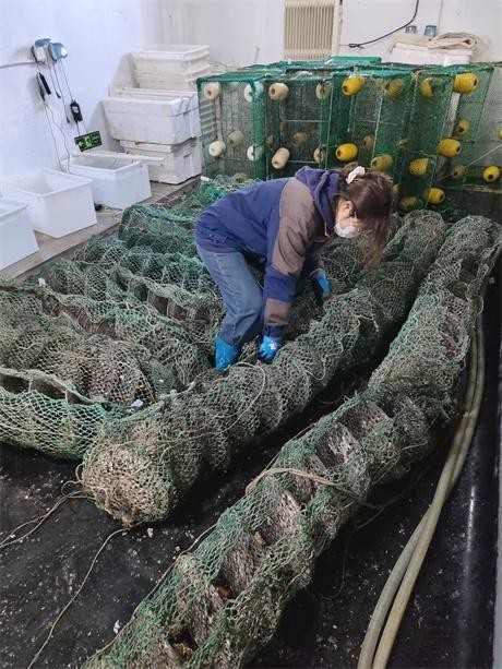 团队成员将在培育池中生长到一定阶段的牡蛎挑选出来,装入养殖笼中。谢雨欣/摄