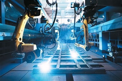 工业机器人在中国重汽集团湖北华威专用汽车有限公司自卸车智能化生产线上作业。
