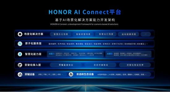 这种自然可靠,且无处不在的新体验背后,离不开智慧化的连接平台。据此前报道,荣耀近期对原有HONOR Connect平台进行全面升级,推出了HONOR AI Connect平台。新平台增设“原子化服务层”与“智慧化能力层”,意味着生态合作伙伴的产品可通过AI Connect SDK快速接入荣耀生态,支持荣耀智能体与AI智慧化服务。
