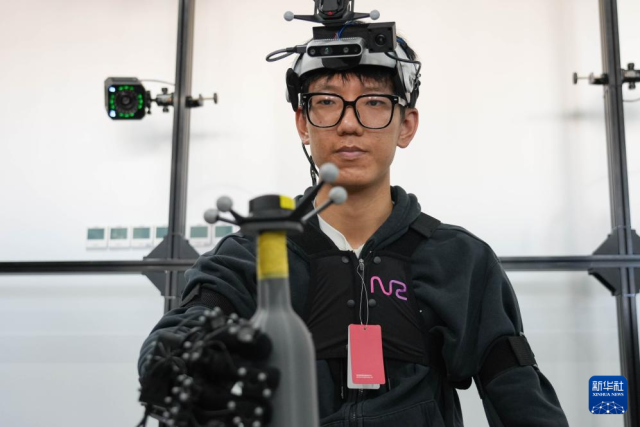 3月18日,在北京中关村(海淀)具身智能创新产业园,诺亦腾机器人的一名工作人员在进行高精度人类行为数据采集。