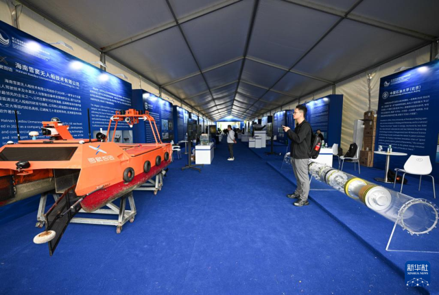 10月29日在深海先进技术及装备成果展上拍摄的智能巡航水面保洁无人船。