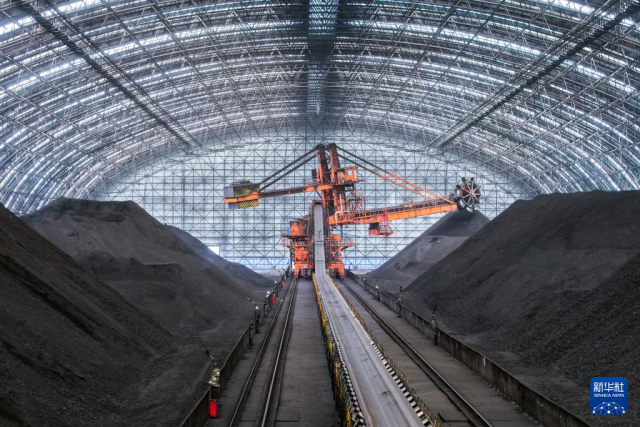 这是11月19日拍摄的甘肃电投常乐电厂煤棚内堆存的燃煤(无人机照片)。