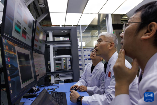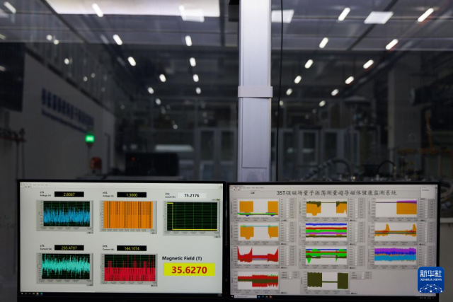 1月26日,在位于北京怀柔的中国科学院物理研究所综合极端条件实验装置极低温强磁场量子振荡实验站,电脑显示屏上显示全超导用户磁体中心磁场强度达到35.6特斯拉。