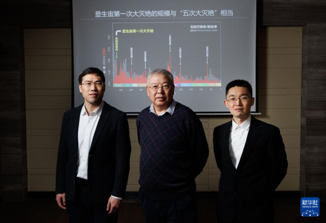 1月22日,在中国科学院南京地质古生物研究所实验室,团队部分成员:中国科学院院士、研究员朱茂炎(中),研究员赵方臣(左),副研究员曾晗(右)合影留念。