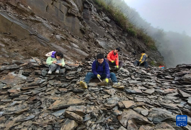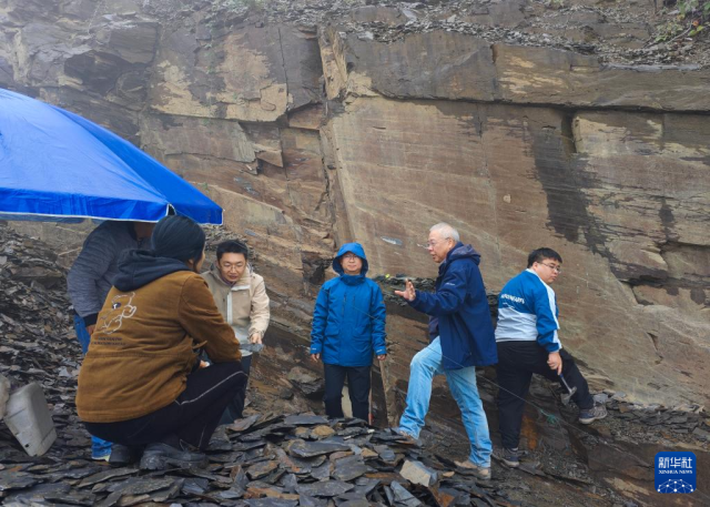 中国科学院院士、研究员朱茂炎(右二)带领野外团队在湖南省湘西土家族苗族自治州花垣县石栏镇磨子村考察化石采坑(2024年11月18日摄)。