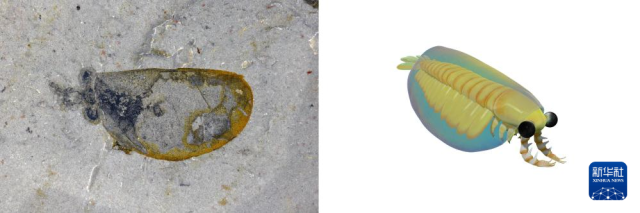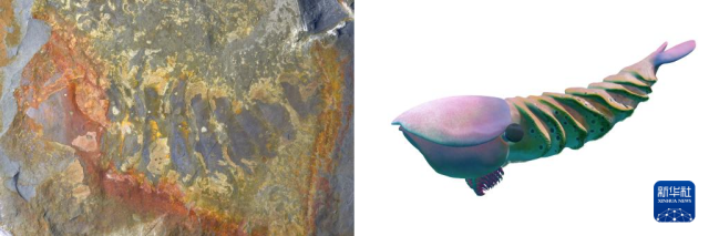 花垣生物群射齿类节肢动物-赫德虾类化石图(左)和复原图。