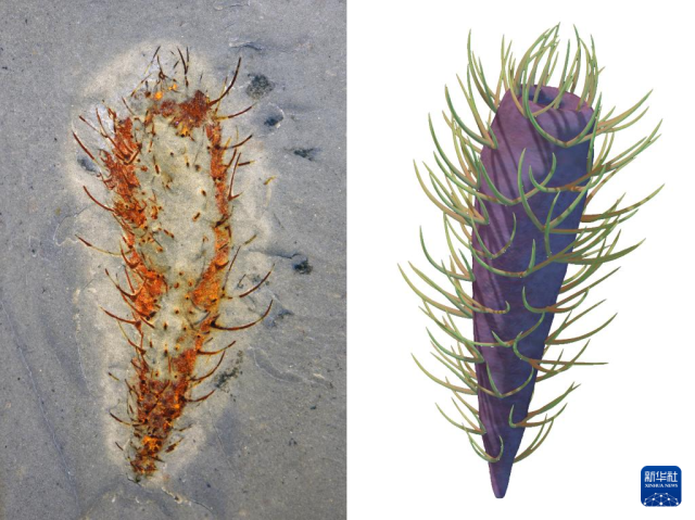 花垣生物群叶足动物-柯林斯虫化石图(左)和复原图。