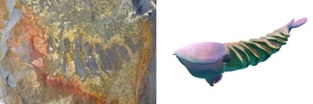 花垣生物群射齿类节肢动物-赫德虾类化石图(左)和复原图。新华社发