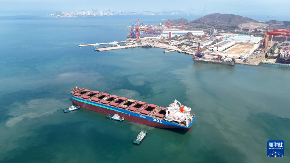 4月13日,21万吨绿色燃料船舶驶离中国船舶集团青岛北海造船有限公司码头启程海试(无人机照片)。