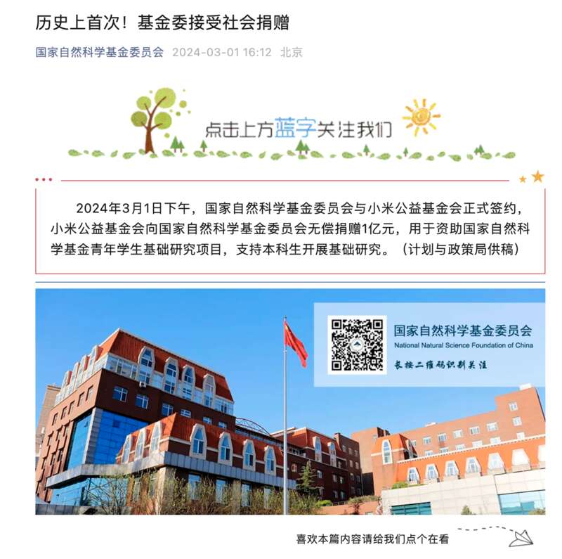 中国青年报客户端北京3月1日电(中青报·中青网记者 张茜)记者从国家自然科学基金委员会公众号获悉,今天下午,国家自然科学基金委员会与小米公益基金会正式签约,小米公益基金会向国家自然科学基金委员会无偿捐赠1亿元,用于资助国家自然科学基金青年学生基础研究项目,支持本科生开展基础研究。
