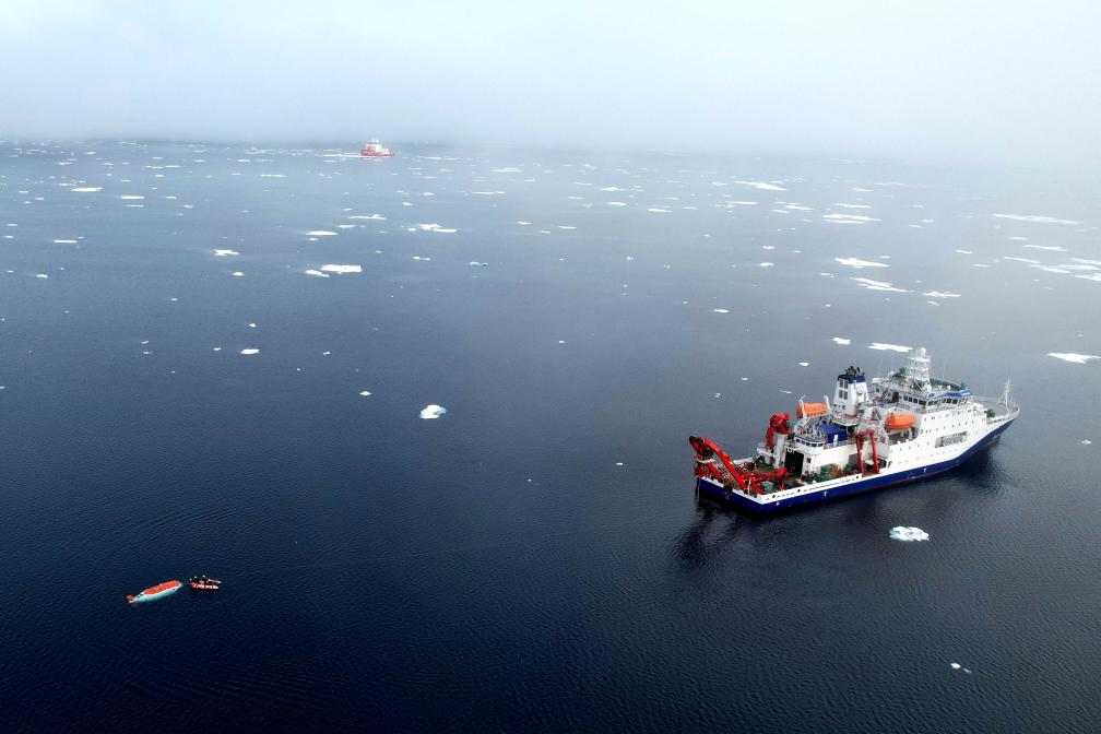 8月4日中午,已经在北冰洋开展科考多日的“雪龙2”号结束阶段性作业,离开海冰密集度非常高的海域,与从国内来到北冰洋冰区的“深海一号”汇合。