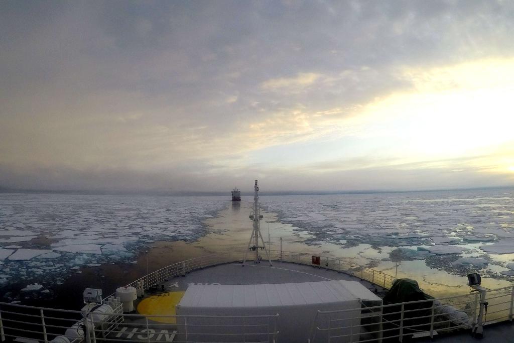 记者看到,“雪龙2”号提前规划好航线,沿航线附近冰薄、冰少区域机动航行。冰情许可时,航迹保持直线,减小冰区转弯半径。两船配合默契,“深海一号”冰区航行顺利。