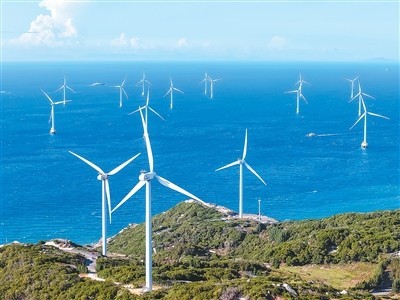 福建省平潭综合实验区聚焦风电产业发展,利用海面风能资源丰富的优势,打造“绿色能源+海上牧场”互补模式,输送绿色电能,助力低碳减排。图为平潭综合实验区苏平片区北部湾海域,风力发电机迎风转动。