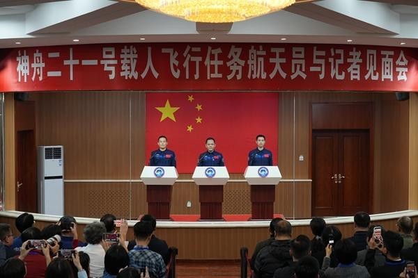 10月30日,神舟二十一号载人飞行任务航天员张陆(中)、武飞(右)、张洪章在酒泉卫星发射中心问天阁与媒体记者集体见面。新华社记者 李明刚/摄